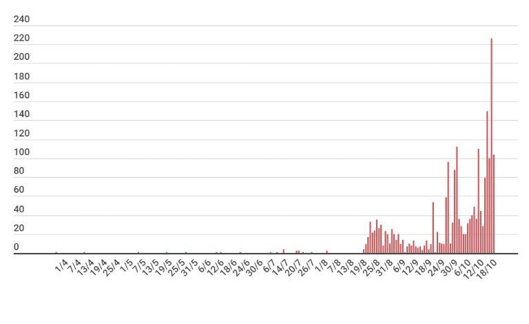 El 17 de octubre fue el día de mayor cantidad de casos registrados en un día, con un total de 226. Lo que puede verse en este último mes es una cantidad irregular de casos diarios, ya que en algunos momentos sube y en otros, baja, aunque la tendencia es a la suba.