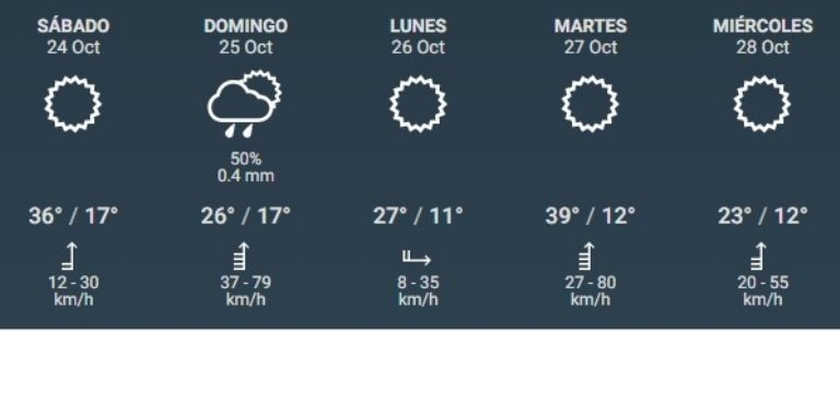 El domingo llegará viento Sur muy fuerte, con ráfagas de hasta 80 kilómetros por hora. Además, podrían darse lluvias aisladas y débiles durante esa jornada.