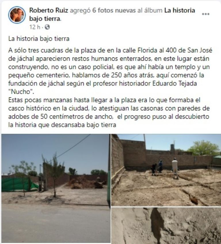 Este martes, el conocido fotógrafo jachallero Roberto Ruiz posteó en las redes sociales una respuesta al misterio, titulada "La historia bajo tierra". Y cuenta que "A sólo tres cuadras de la plaza, en la calle Florida al 400 de San José de Jáchal, aparecieron restos humanos enterrados, en este lugar están construyendo. No es un caso policial, es que ahí había un templo y un pequeño cementerio, hablamos de 250 años atrás, aquí comenzó la fundación de Jáchal, según el profesor historiador Eduardo Tejada "Nucho". Estas pocas manzanas hasta llegar a la plaza era lo que formaba el casco histórico en la ciudad, lo atestiguan las casonas con paredes de adobes de 50 centímetros de ancho, el progreso puso al descubierto la historia que descansaba bajo tierra".