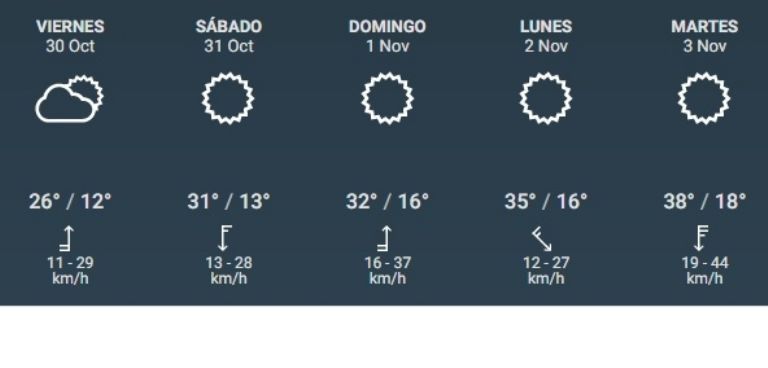 El viernes la temperatura máxima subirá apenas un poco, llegando a los 26º. Ya para el sábado se instalará nuevamente el calor (31º), subiendo un poco todos los días hasta llegar al martes, cuando se registrarán 38º.