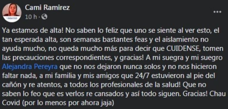 Para cerrar, la recuperada destacó a los protagonistas necesarios de toda la pandemia: “Gracias a todos los profesionales de la salud! Que no saben lo feo que es verlos re cansados y así todo siguen”.