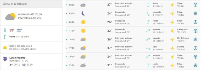 Mañana jueves se verán principalmente intervalos nubosos en San Juan. Las temperaturas oscilarán entre 22° y 38°, cuya máxima se alcanzará sobre las 17.