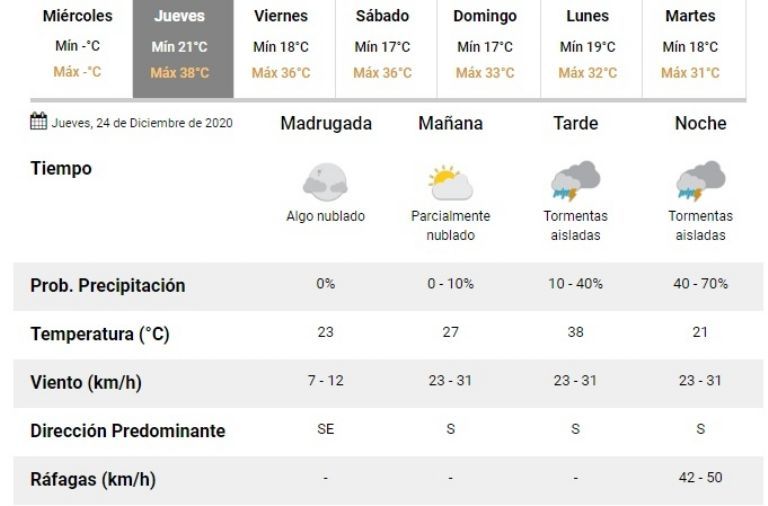 Según el sitio especializado Meteored, mañana jueves 24 de diciembre se verán principalmente cielos despejados en San Juan, aunque se esperan intervalos nubosos por la tarde. Las temperaturas oscilarán entre 24°Cy 37°, cuya máxima se alcanzará sobre las 15. A lo largo del día, prevalecerá el viento fuerte del sector Sur, a razón de 52 km/h por la tarde.