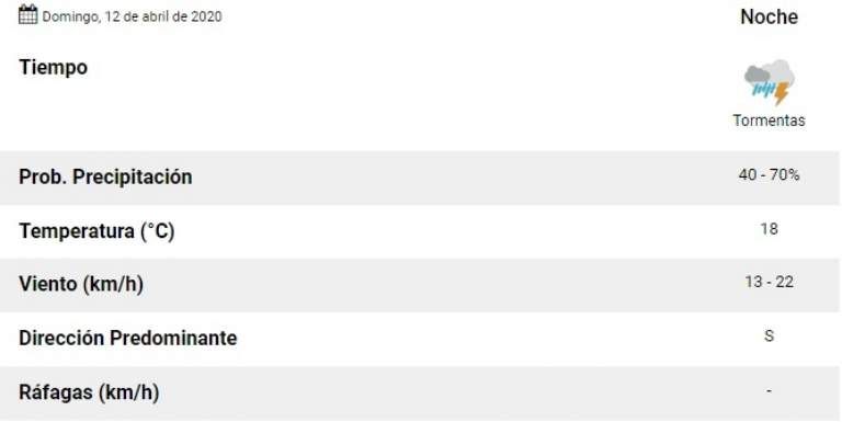 El Servicio Meteorológico Nacional anunció una probabilidad de lluvia para la noche de este domingo en San Juan. Según consta en su página web, hay una gran posibilidad de que lleguen las tormentas durante la noche y, posiblemente, se extienda hasta la madrugada del lunes.