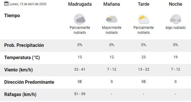El Servicio Meteorológico Nacional pronosticó que el lunes estará nublado durante todo el día. En la madrugada, tarde y noche estará parcialmente nublado; mientras que en la mañana, nublado totalmente. La temperatura no pasará los 25 grados: en la madrugada 13º; en la mañana, 12º; en la tarde rondará los 23 grados; y en la noche, los 19º.