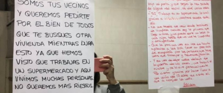 “Esta es la hija de remil putas que va a enfermar a todo el barrio”, dice un hombre por Facebook. “Hay que prenderle fuego”, le comenta otro. “Yo no voy a dejar que contagie a mi familia, hay que difundir su cara para que estemos preparados”, señala otra señora. “Si te llego a ver te mato”, dice uno de los carteles que ejemplifica un escenario global que también nos atañe.