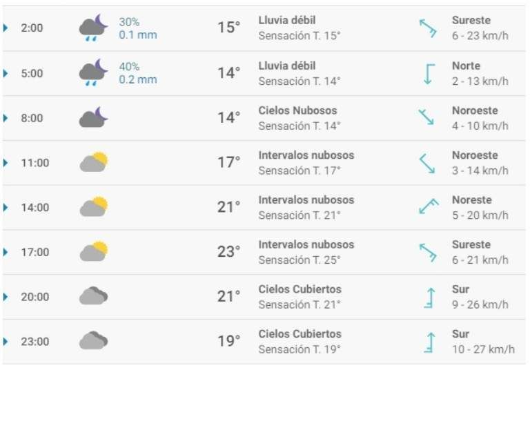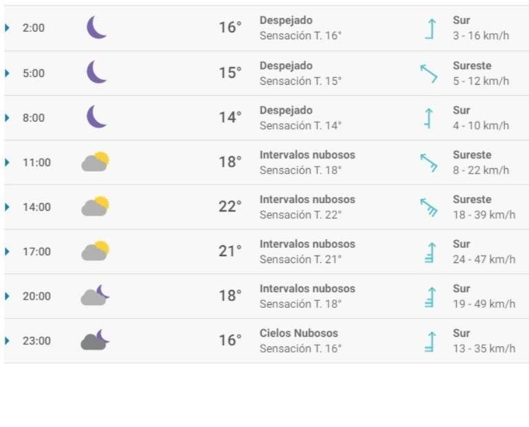 Este sábado se verán principalmente cielos despejados en San Juan, aunque se esperan cielos nubosos por la noche. Las temperaturas oscilarán entre 13° y 23° durante el día, cuya máxima se alcanzará sobre las 15. A lo largo del día, prevalecerá el viento moderado de sur, con rachas que podrán llegar hasta 49 km/h por la noche.