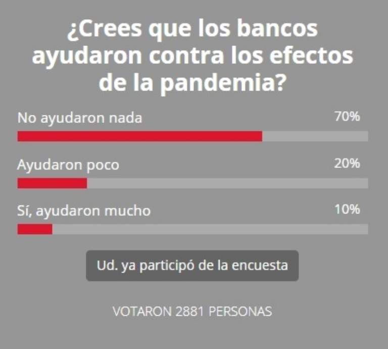 Los bancos fueron unos de los sectores más criticados durante la cuarentena y los sanjuaninos parecen estar en la misma línea. Casi 3000 lectores de Tiempo de San Juan votaron sobre cuál había sido el rol de las entidades durante este mes y medio y el resultado fue un tirón de orejas.