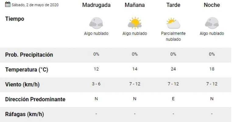 Según pronostica el Servicio Meteorológico Nacional, el sábado será un día bastante fresco, con una mínima de 12 -en la madrugada- y una máxima de 24 grados, por la tarde. En tanto, sobre la mañana oscilarán los 14 grados y en la noche, los 18. No habrá lluvia. Mirá: