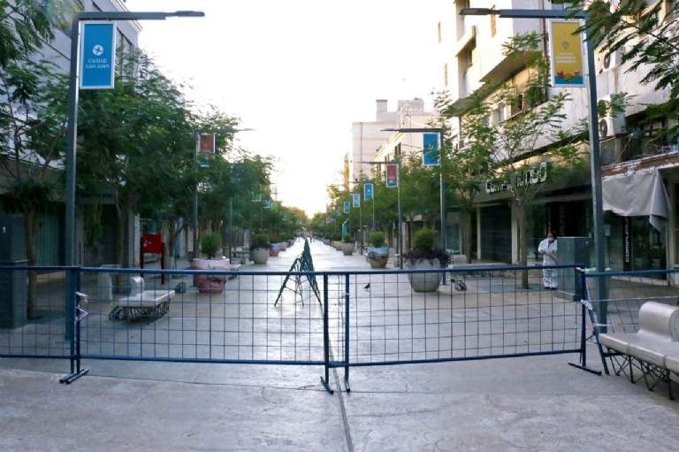 Los cortes de calle también fueron protagonistas en el microcentro sanjuanino. Las calles Mendoza, Laprida, Santa Fe e Ignacio de la Roza tienen cortes en las zonas más cercanas a la peatonal y la mayor concentración de locales. El objetivo es habilitar más espacio entre compradores cuando caminen por la vía pública.