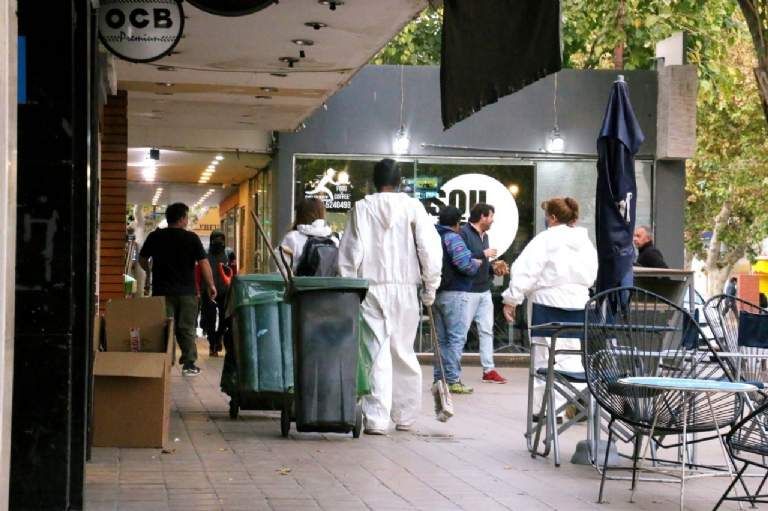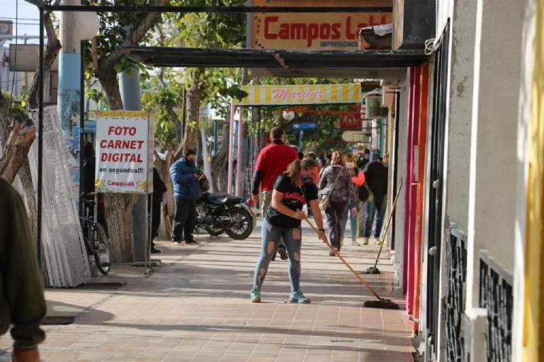 La higiene de veredas también fue trabajo de los comerciantes, como en este caso de una mujer en Villa Krause, cuyo centro comercial empezó esta nueva etapa con todo, desde bien temprano y con muchos compradores.