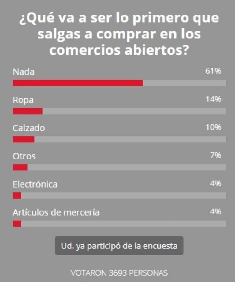 Los sanjuaninos lectores de Tiempo de San Juan volvieron a sorprender, tras asegurar la gran mayoría que no van a comprar nada tras la reapertura del comercio. El 61% de los más de 3600 votantes eligieron esta opción en una encuesta publicada por este medio, mientras que el restante 39% se dividió entre otras cinco opciones, por lo que hubo una diferencia importante entre el primero y los restantes.