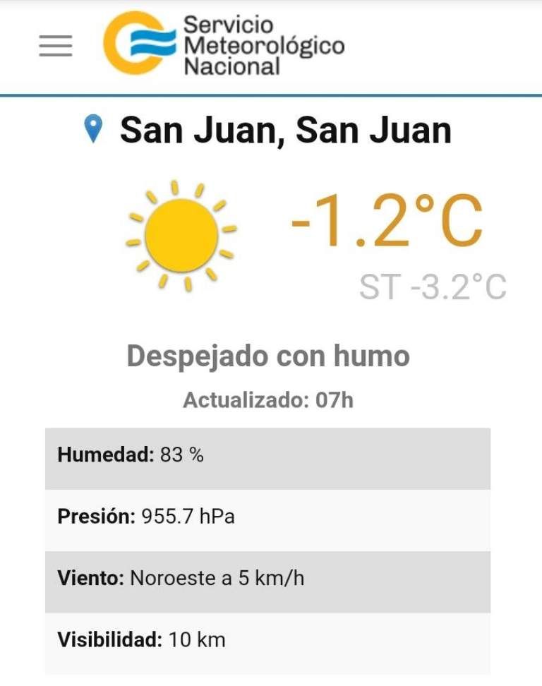 SUSCRIBITEEste sábado amaneció con una tremenda helada en buena parte de la provincia de San Juan, registrando el Servicio Meteorológico Nacional -1,2º a las 7.00, con una sensación térmica de -3,2º.
