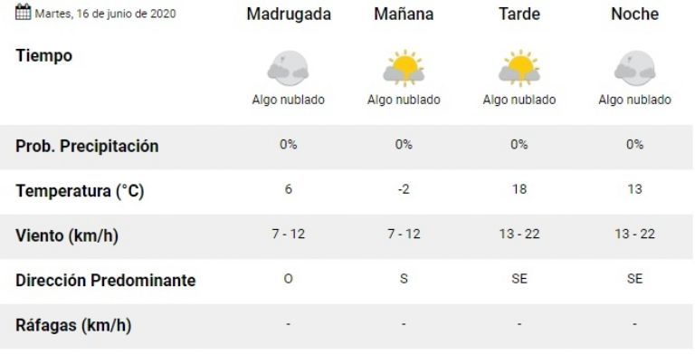Al menos un martes frío se espera en San Juan para la jornada del martes. Así lo explicitó el Servicio Meteorológico Nacional, ente que pronosticó una mínima de -2º en horas de la mañana; y una máxima de 18 grados para la tarde.