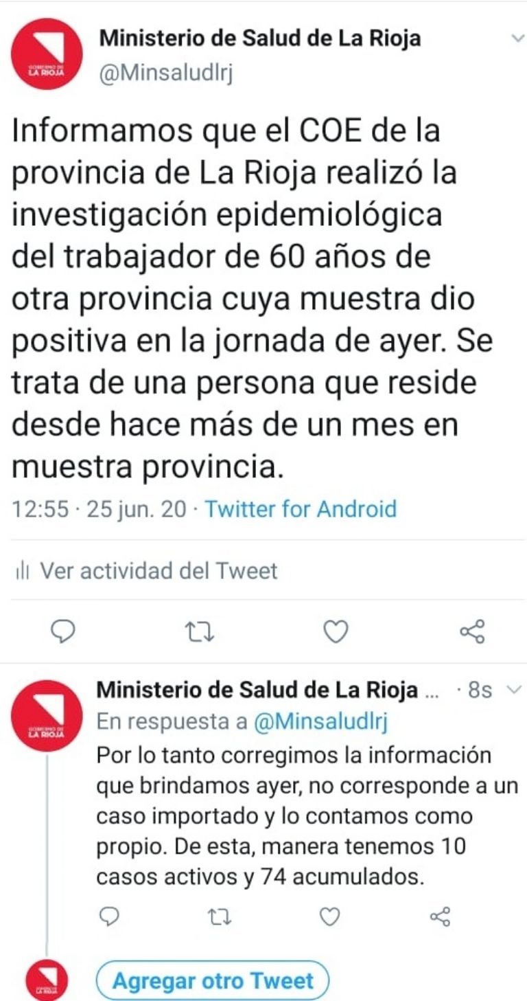Tras conocerse que un sanjuanino fue detectado en las últimas horas como positivo de coronavirus en La Rioja, y publicar el Ministerio de Salud de ese distrito y escucharse declaraciones de un alto funcionario riojano de que se trata de un "caso importado" para ellos, es decir, que podría haber sido infectado en San Juan, ahora el Gobierno rectificó sus propios dichos. En un comunicado oficial, el Ministerio de Salud de La Rioja informó que esta persona está en esa provincia "desde hace más de un mes" por lo que lo cuentan como propio al caso.