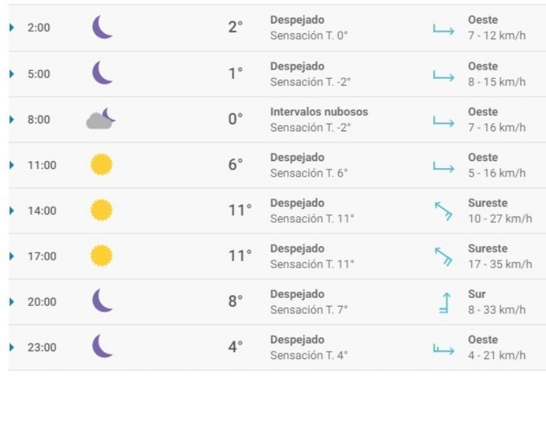 El miércoles se verán principalmente cielos despejados en San Juan, aunque se esperan intervalos nubosos por la mañana. Las temperaturas oscilarán entre -1° y 12° durante el día, cuya máxima se alcanzará sobre las 15. A lo largo de la jornada prevalecerá el viento moderado de sureste, con rachas que podrán llegar hasta 36 km/h por la tarde.