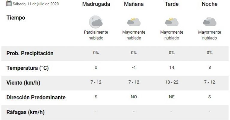 Un sábado bastante frío pronostica el Servicio Meteorológico Nacional para San Juan. Según el ente, podría haber temperaturas bajo cero por la mañana. Aparentemente llegaría a un pico de -4º, mientras que por la madrugada la temperatura se clavará en los 0 grados.