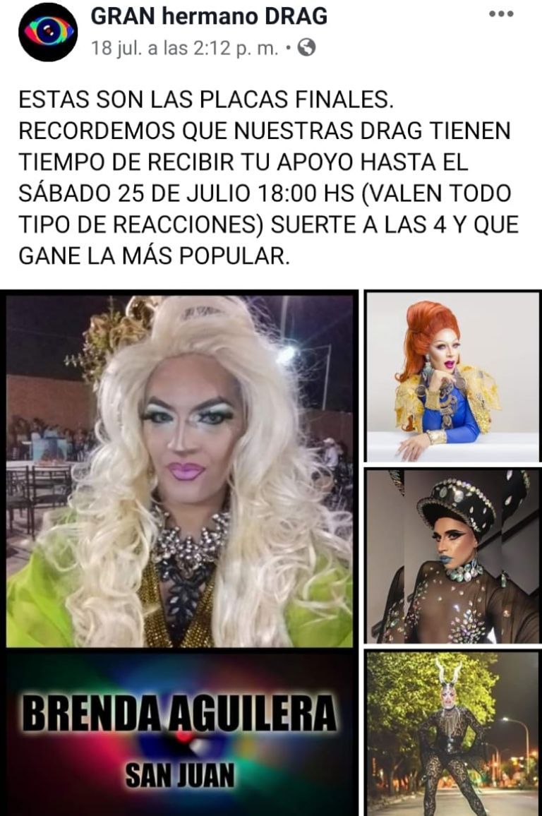 Ha participado en dos fiestas nacionales "El sol nos une", resultó electa Reina Nacional Social en un certamen realizado en Córdoba además de ser la protagonista de shows artísticos en donde la rompe en el escenario. Se trata de Brenda Aguilera, una drag queen sanjuanina que ha llegado a la final del Gran Hermano Drag, que se organizó con participantes de todo el país y que ha llegado a su etapa final. Brenda compite con las representantes de Córdoba, San Luis y Mendoza por la corona que la catapulta como la Drag Queen más popular del país.