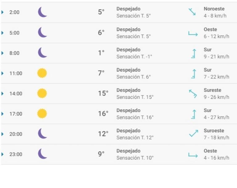 El domingo se verán principalmente cielos despejados en San Juan. Las temperaturas oscilarán entre 0° y 18° durante el día, cuya máxima se alcanzará sobre las 16. A lo largo de la jornada prevalecerá el viento moderado de sur, con rachas que podrán llegar hasta 28 km/h por la tarde.