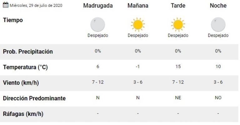 Un miércoles bastante frío pronostica el Servicio Meteorológico Nacional para San Juan. Según el ente, podría haber temperaturas bajo cero por la mañana. Aparentemente llegaría a un pico de -1º, mientras que por la madrugada la temperatura rondará en los 0 grados.