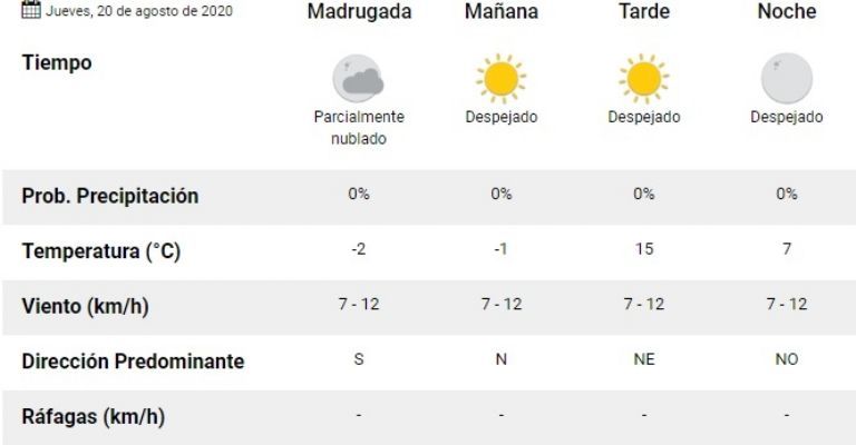 Un jueves bastante frío pronostica el Servicio Meteorológico Nacional para San Juan. Según el ente, podría haber temperaturas bajo cero por la madrugada y mañana. Aparentemente llegaría a un pico de -1º por la mañana, mientras que por la madrugada la temperatura rondará en los -2 grados.