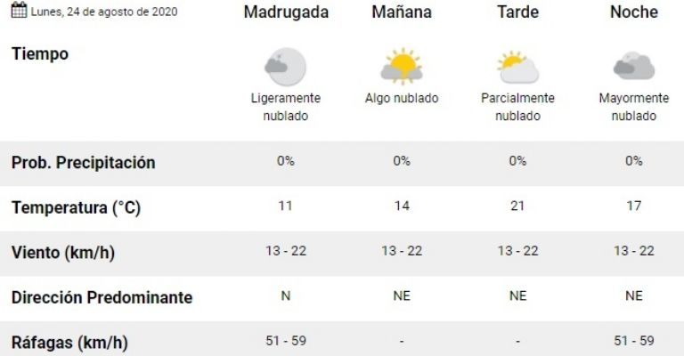 El Servicio Meteorológico Nacional pronosticó que el lunes estará nublado durante todo el día. En la mañana y en la tarde estará algo nublado y parcialmente nublado, respectivamente; mientras que en la madrugada y en la noche, nublado totalmente. La temperatura no pasará los 21 grados: en la madrugada 11º; en la mañana, 14º; en la tarde rondará los 21 grados; y en la noche, los 17º.