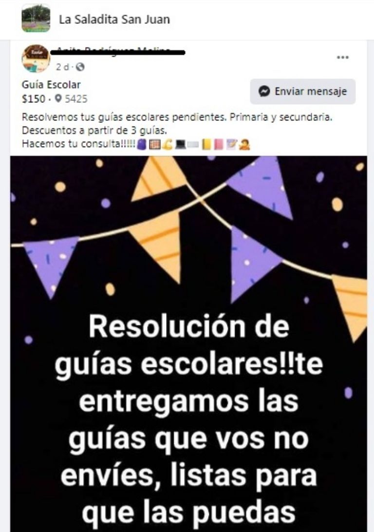 El posteo apareció hace un par de días en la reconocida página de Facebook La Saladita San Juan, donde se ofrecen productos y servicios varios,. A título de "Guía Escolar $150", una mujer ofrece sus servicios con el siguiente texto: "Resolvemos tus guías escolares pendientes. Primaria y secundaria. Descuentos a partir de 3 guías. Hacemos tu consulta!!!!!". Y en una imagen prometen: "resolución de guías escolares!! te entregamos las guías que vos no envíes, listas para que las puedas transcribir a tu cuaderno!".