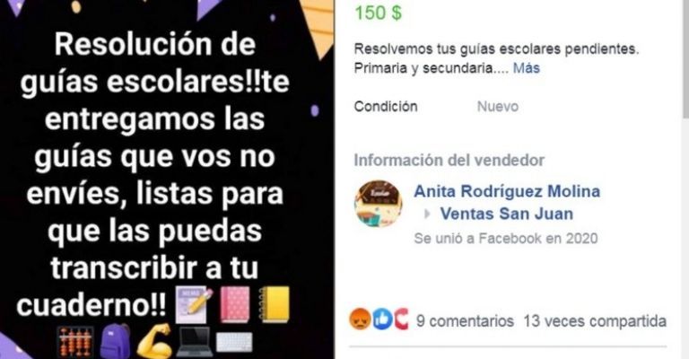 Algunos sanjuaninos publicaron en las redes sociales un servicio que generó polémica en la comunidad educativa. "Resolvemos tus guías escolares pendientes. Primaria y secundaria. Descuentos a partir de 3 guías. Hacemos tu consulta!!!!!", postearon algunos usuarios de los grupos de Compra y Venta San Juan o La Saladita San Juan, que son sitios de Facebook que se utilizan para ofrecer productos y servicios variados.