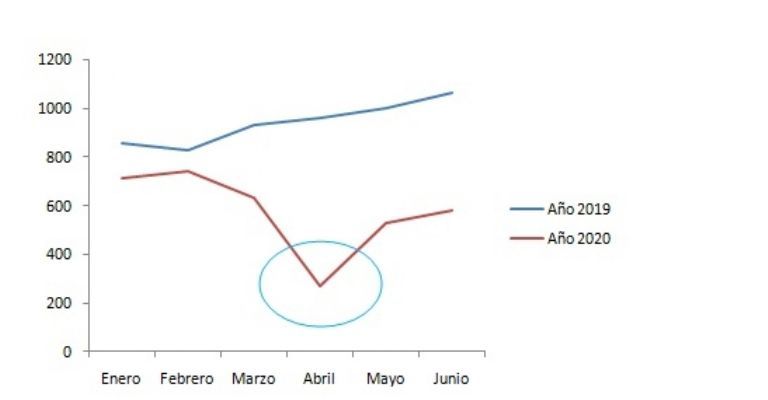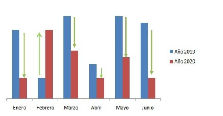 El gráfico representa los siniestros totales (con fallecidos, heridos y colisiones) del primer semestre de 2019 y 2020.