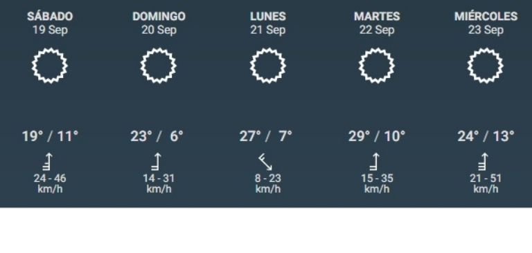 El sábado continuará soplando el viento fresco y hará descender la temperatura aún más, de hecho la máxima de ese día será de 19º. El domingo comenzará a subir para llegar al martes con una máxima de alrededor de 30º. Los próximos días el cielo estará despejado.