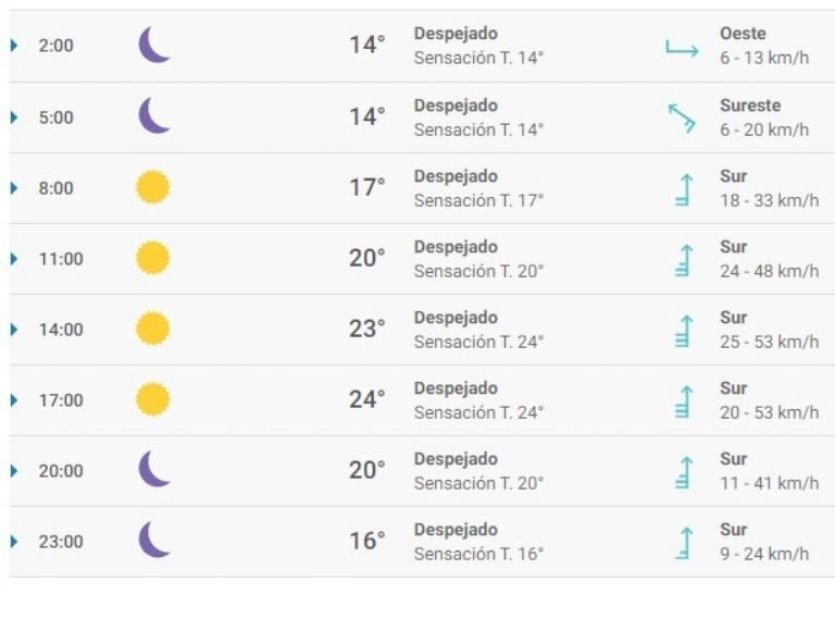 Mañana se verán principalmente cielos despejados en San Juan. Las temperaturas oscilarán entre 12° y 24° durante el día, cuya máxima se alcanzará sobre las 16. A lo largo de la jornada prevalecerá el viento fuerte de sur, con rachas que podrán llegar hasta 54 km/h por la tarde. Sin embargo, el viento Sur empezará a soplar con mayor intensidad aproximadamente desde las 10 de la mañana.