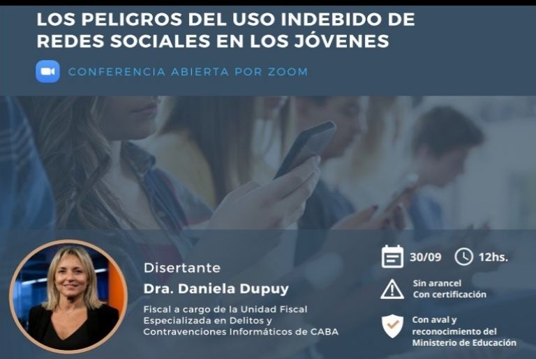 El próximo 30 de septiembre tendrá lugar una conferencia abierta por Zoom en la cual se desarrollará la temática “los peligros del uso indebido de las redes sociales en los jóvenes”. La actividad es organizada por la Corte de Justicia a través de la Escuela Judicial, con el reconocimiento del Gobierno de San Juan a través del Ministerio de Educación. La disertante de la conferencia será Daniela Dupuy, Fiscal a cargo de la Unidad Fiscal Especializada en delitos y contravenciones informáticos de CABA.