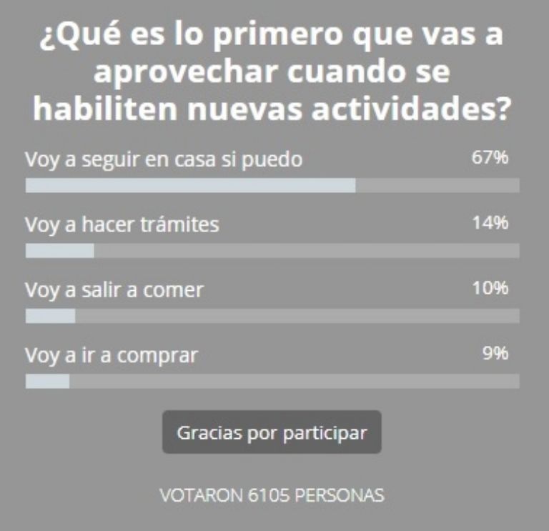 Ante esto, Tiempo consultó con sus lectores qué van a hacer tras las habilitaciones o si van a intentar seguir en casa. En un día se sumaron más de 6000, de las cuales la amplia mayoría adelantó que en caso de que sea posible seguirán en sus viviendas. Específicamente, el 67% dijo que esta será la actitud que tomarán a pesar de las aperturas.