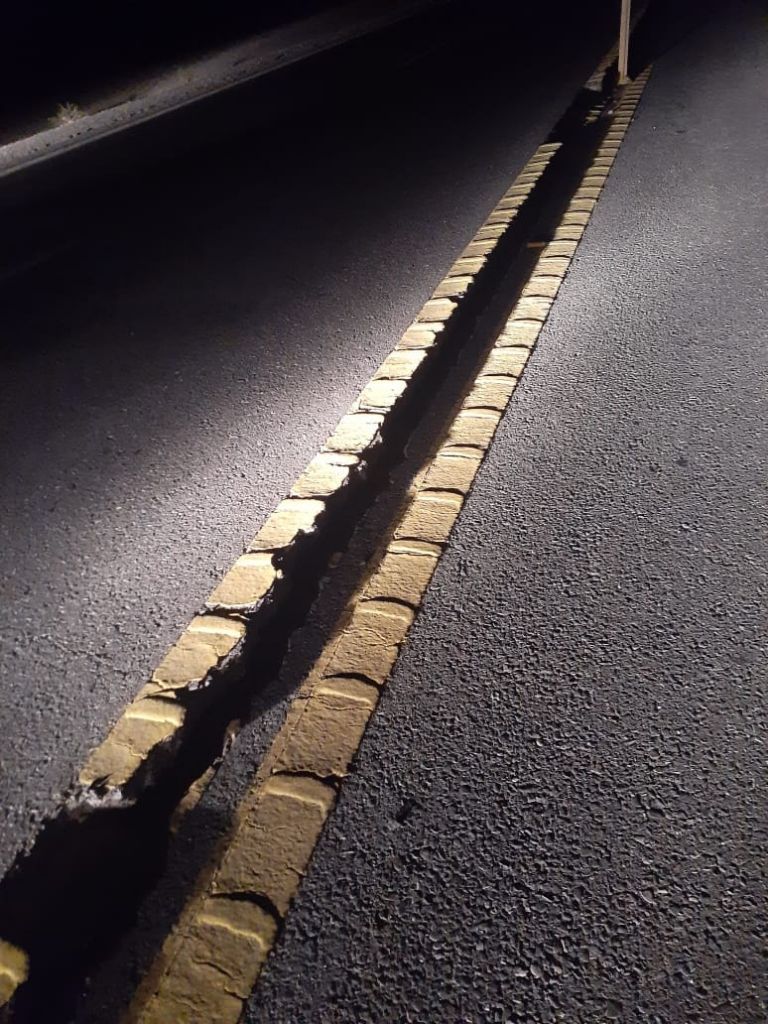 A simple vista se puede observar un desnivel en los separadores de la Ruta 40. La grieta recorre una parte del pavimento e impresiona debido a su extensión.