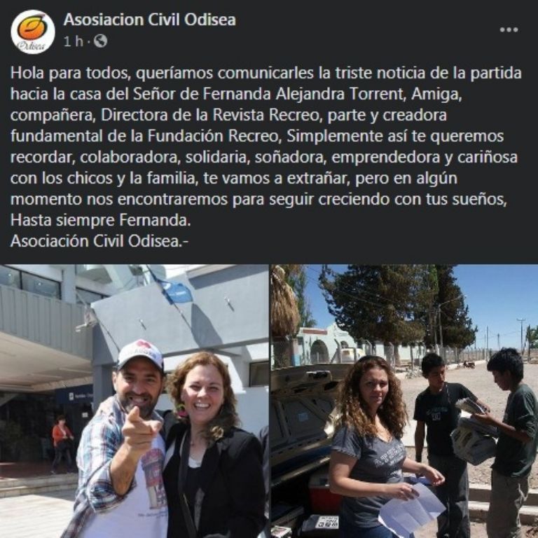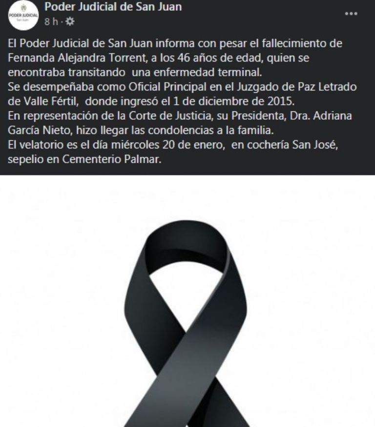 Este miércoles se conoció una triste noticia para el ambiente judicial de San Juan. Tras una larga enfermedad, falleció Fernanda Alejandra Torrent, de 46 años. La mujer fue Oficial Principal en el Juzgado de Paz Letrado de Valle Fértil. La presidenta de la Corte de Justicia de San Juan envió condolencias la familia de la difunta.