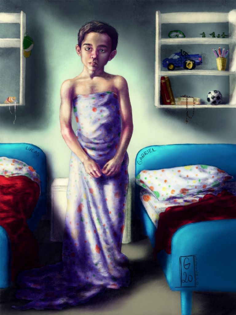 ¿Qué te desnudó como artista? "Me sentí muy desnudo cuando hice dos ilustraciones con historias cortas, era algo que venía pensando pero un día sentí la vulnerabilidad a flor de piel y agarré un cuaderno con retratos míos hechos en acuarela de cuando tenía ocho años. Tenía una remera de fútbol que me habían regalado, para mis hermanos esas remeras eran todo pero para mí no significaba nada. Un día me estaba por bañar y se me quedó trabada la remera en la cabeza y yo me imaginé que era el pelo largo que siempre quise tener. Publicar algo tan íntimo, que ni mi vieja sabe, me desnudó como artista", contó Gabriel. Tras esa publicación, muchos me escribieron para contarme sus experiencias.
