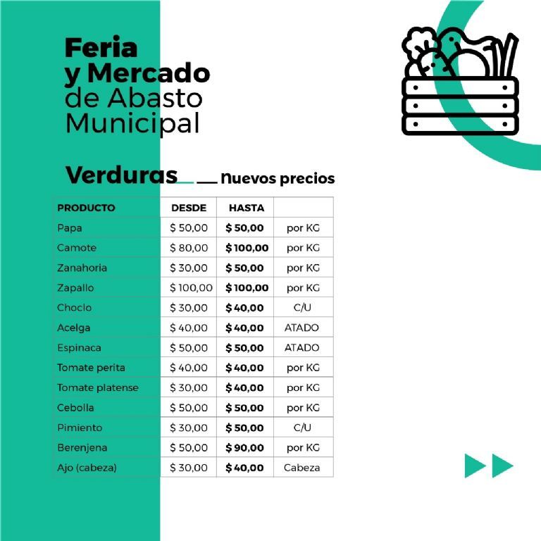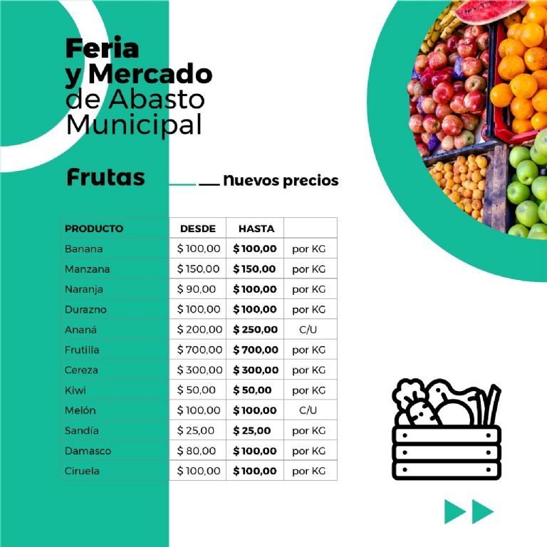 La Secretaría de Ambiente y Servicios, a través de su Dirección de la Feria y Mercado de Abasto, informó a la comunidad en general, los precios vigentes de frutas, verduras y carne que se comercializan en el Mercado de Abasto de la Capital.