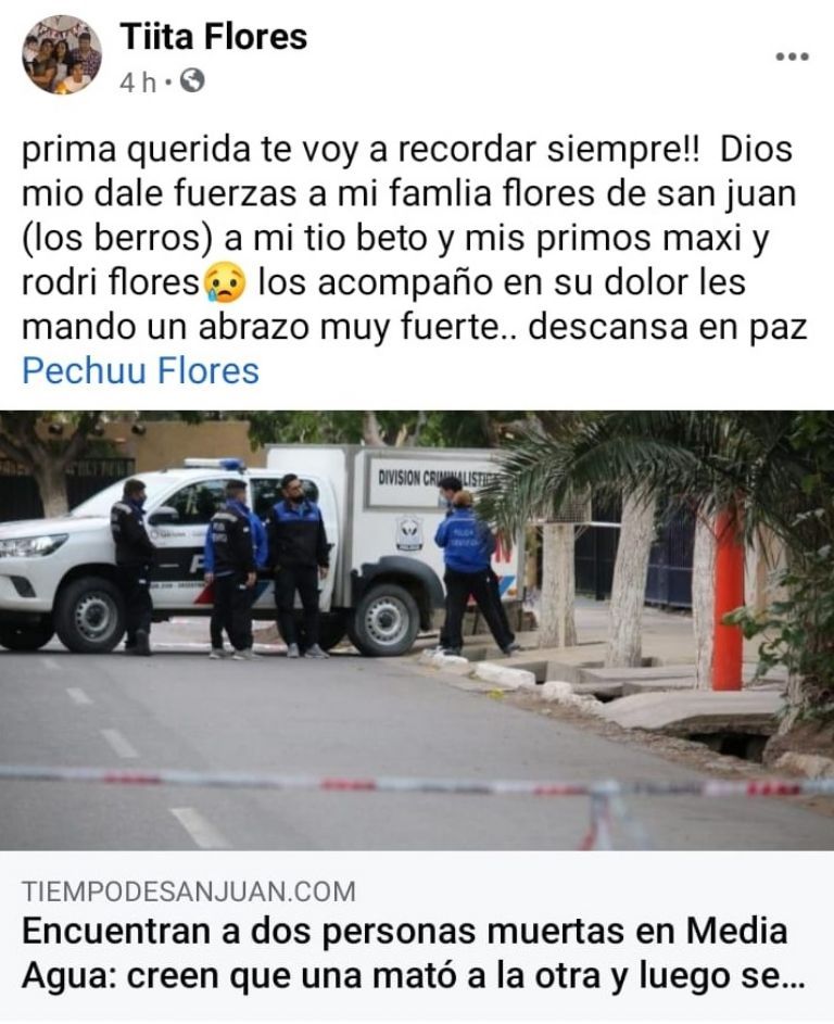 Tita Flores publicó: "Prima querida te voy a recordar siempre!! Dios mío dale fuerzas a mi familia Flores de San Juan (Los Berros) a mi tío Beto y mis primos Maxi y Rodri Flores, los acompaño en su dolor les mando un abrazo muy fuerte.. descansa en paz Pechuu Flores".