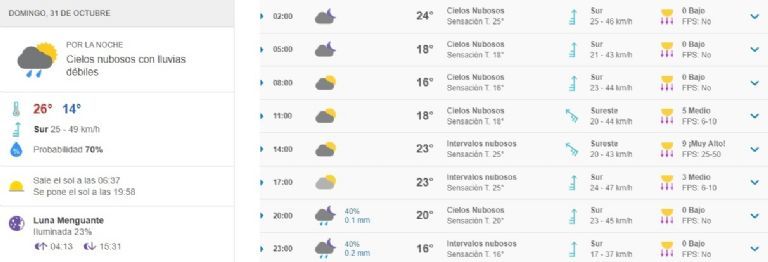 Para el domingo se prevé una jornada con un significativo descenso de la temperatura. La mínima llegará a los 14º y la máxima rondará los 24º. Habrá viento del Sur con ráfagas de hasta 59 km/h. El cielo permanecerá mayormente nublado.