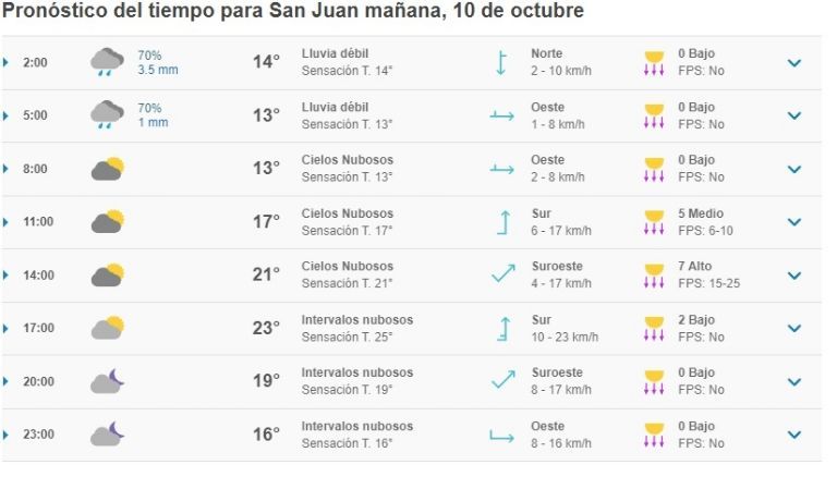 La temperatura rondará los 24 grados de máxima y los 12 de mínima. También se esperan chaparrones con un 40% de probabilidades para la tarde de este 10 de octubre en San Juan.