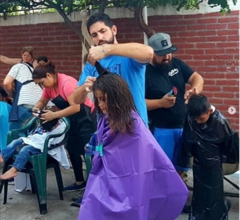 Matías brindando un curso, hace dos años. Como parte, cortaron el pelo gratis a los niños en un comedor.