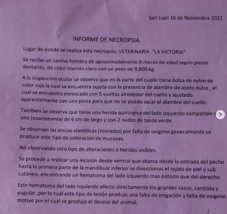 "El informe profesional es evidente y no se puede negar que la pobre perra sufrió horrores antes de morir", agregaron. Además, aseguran saber quién fue el autor de semejante hecho, por lo que "se hará la denuncia correspondiente y rogamos que la justicia actúe con celeridad"