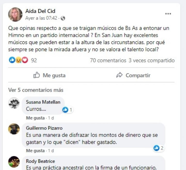 Quien movió el avispero en las redes fue la directora del coro de la UNSJ, Aída del Cid, quien disparó: "Que opinas respecto a que se traigan músicos de Bs As a entonar un Himno en un partido internacional? En San Juan hay excelentes músicos que pueden estar a la altura de las circunstancias, ¿por qué siempre se pone la mirada afuera y no se valora el talento local?". El posteo abrió un debate que no es nuevo en la Provincia y generó múltiples comentarios criticando la situación y defendiendo lo local.