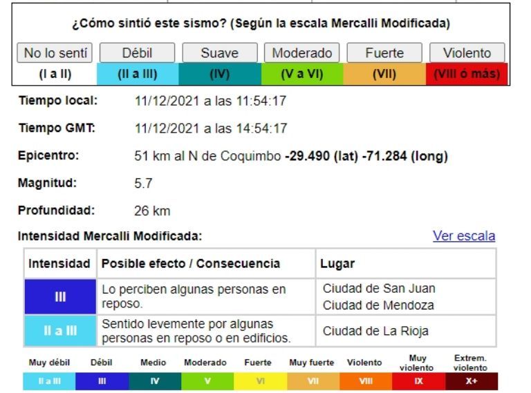 Ocurrió a las 11:54 y tuvo una magnitud de 5.7, además de una profundidad de 26 km. Su epicentro fue 51 km. al norte de Coquimbo, por lo que se sintió en nuestra provincia y en suelo mendocino. Mirá todo el detalle del sismo publicado en la página oficial del INPRES.