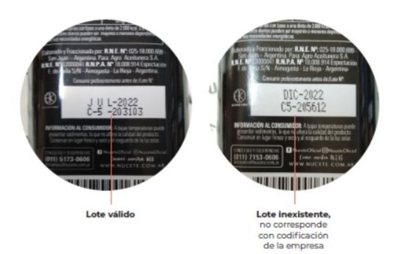 Se trata del “Aceite de Oliva Virgen Extra”, variedad Clásico, de la marca Nucete, elaborado y fraccionado por RNE Nº 025-18000699, San Juan, en botella de 500 ml. El producto carecía de registros y estaba falsamente rotulado, utilizando registros de un establecimiento y productos pertenecientes a Agro Aceitunera SA, y por lo tanto es ilegal.