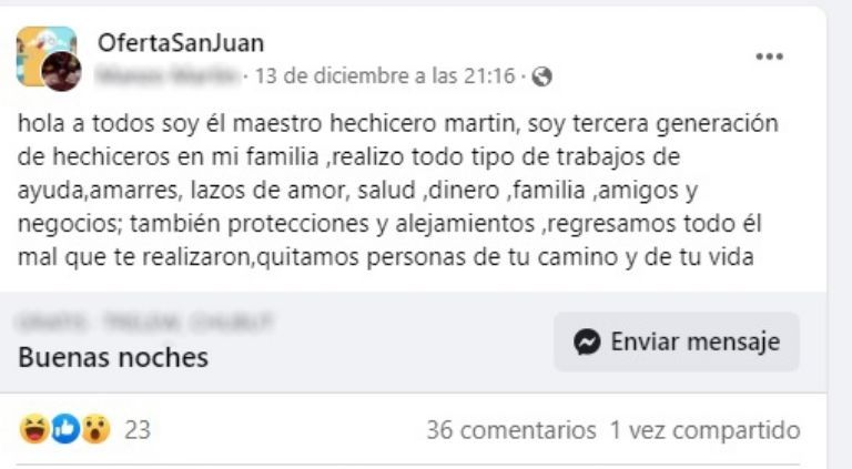 Tras pasarle un necesario filtro ortográfico, la oferta con aires fantásticos –y un acentuado olor a estafa- que desató la originalidad de los sanjuaninos fue la siguiente: “Hola a todos . Soy el maestro hechicero Martín. Soy tercera generación de hechiceros en mi familia. Realizo todo tipo de trabajos de ayuda, videncia, amarres, lazos de amor, salud, dinero, familia, amigos y negocios. También protecciones y alejamientos. Regresamos todo el mal que te han hecho. Quitamos personas de tu camino y de tu vida”.
