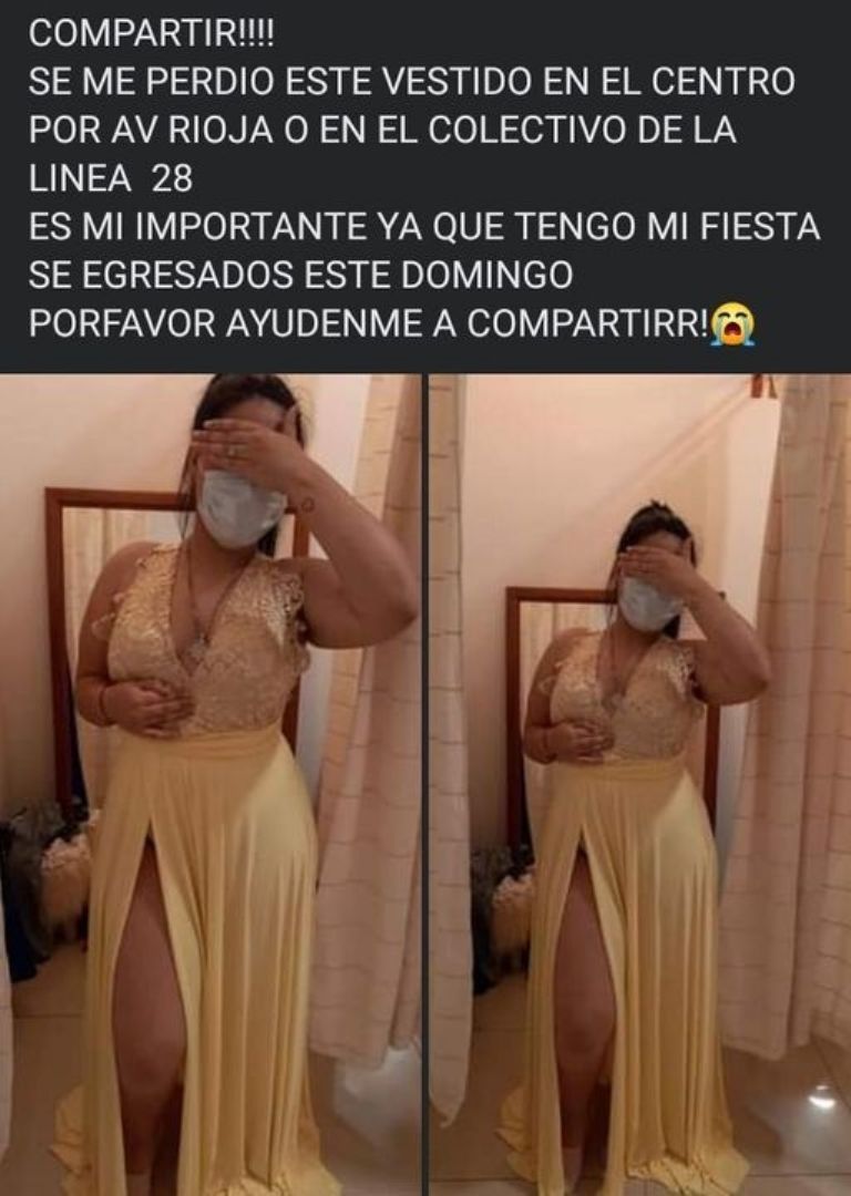 A través de las redes sociales, la estudiante contó que extravió el vestido que había comprado con ayuda de su familia para la fiesta. Se trata de un atuendo de color amarillo, con encaje y escote. "Estábamos esperando el colectivo en Avenida Rioja, sentadas en el boulevard y de repente nos cruzamos a tomar el 28. Fue ahí cuando se extravió la bolsa. Al parecer la dejamos cuando nosotros nos sentamos", comentó Daniela, hermana de la joven.