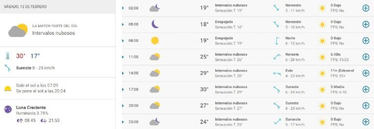 Según el pronóstico, este sábado se verán principalmente intervalos nubosos en San Juan. Las temperaturas oscilarán entre 17° y 30°, cuya máxima se alcanzará sobre las 17. A lo largo del día, prevalecerá el viento moderado del Sureste, con rachas que podrán llegar hasta 25 km/h por la tarde.
