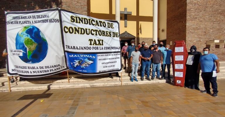 Este miércoles la "parca" estuvo presente en pleno centro de San Juan. La imagen mortuoria fue utilizada por un grupo de taxistas sanjuaninos que reclamaron por más licencias en la puerta de la Catedral. La protesta comenzó pasadas las 8 de la mañana, por lo que el transito se vio dificultado en tan concurrida zona. Se trata de unos miembros del Sindicato de Conductores de Taxis que volvieron a insistir por quitar las licencias a los propietarios de las agencias para que pasen directamente a manos de los trabajadores.