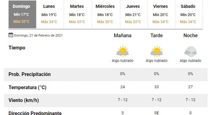 El Servicio Meteorológico Nacional anunció para la jornada de este domingo una máxima de 33º, luego de haber registrado una mínima de 17º. Durante todo el día el cielo estará algo nublado, incluso en la noche, y no hay probabilidad de lluvias o vientos.